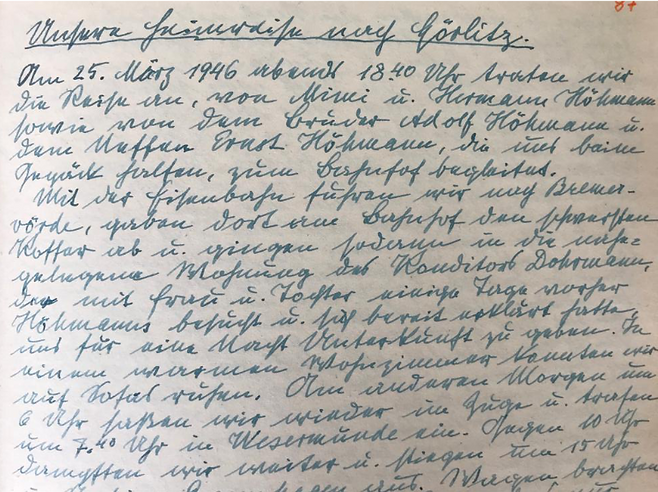 Am 25. März 1946 abends 18.40 Uhr traten wir die Reise an, von Mimi und Hermann Höhmann sowie von dem Bruder Adolf Höhmann u. dem Neffen Ernst Höhmann, die uns beim Gepäck halfen, zum Bahnhof begleitet.