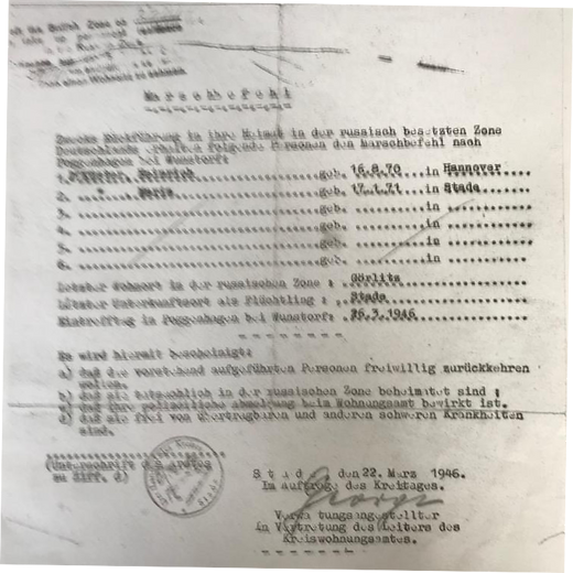 Am 12. Februar 1945 war das Ehepaar mit 8 Gepäckstücken nach Bad Lauterberg geflohen und am 13./14. August nach Stade zu Verwandten der Großmutter „Mimi“ weitergereist.